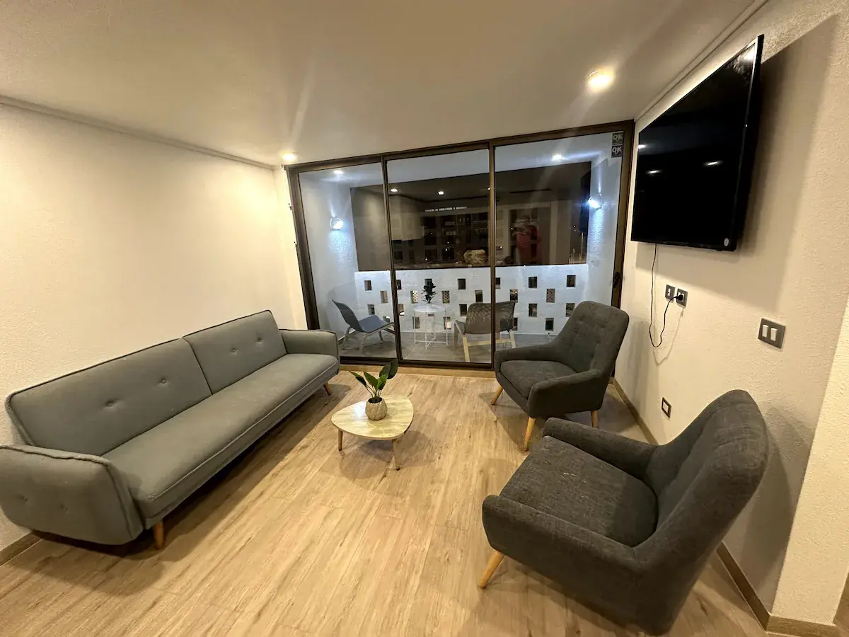 Departamento de 90 metros cuadrados con terraza y habitación matrimonial con vista al mar, televisión e internet wifi y ubicado a pasos del casino.